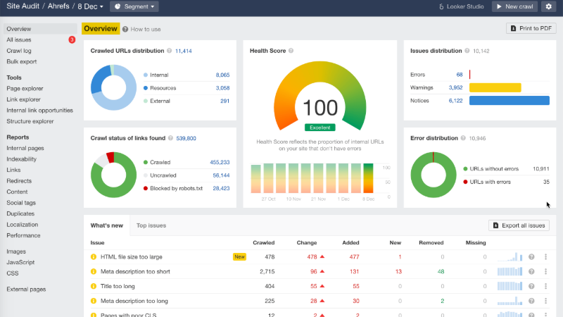 Ahrefs Site Audit is part of the comprehensive Ahrefs toolset, offering an accessible solution to check a site’s technical health. It’s particularly useful for users who already leverage Ahrefs for backlink analysis or keyword research.