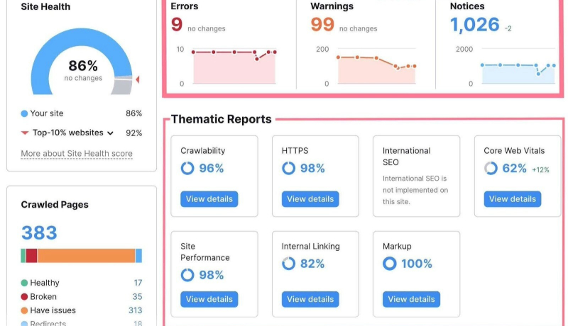 - Comprehensive Audit Tool: SEMrush covers everything from crawlability to HTTPS and internal linking, making it an all-in-one solution for technical SEO.